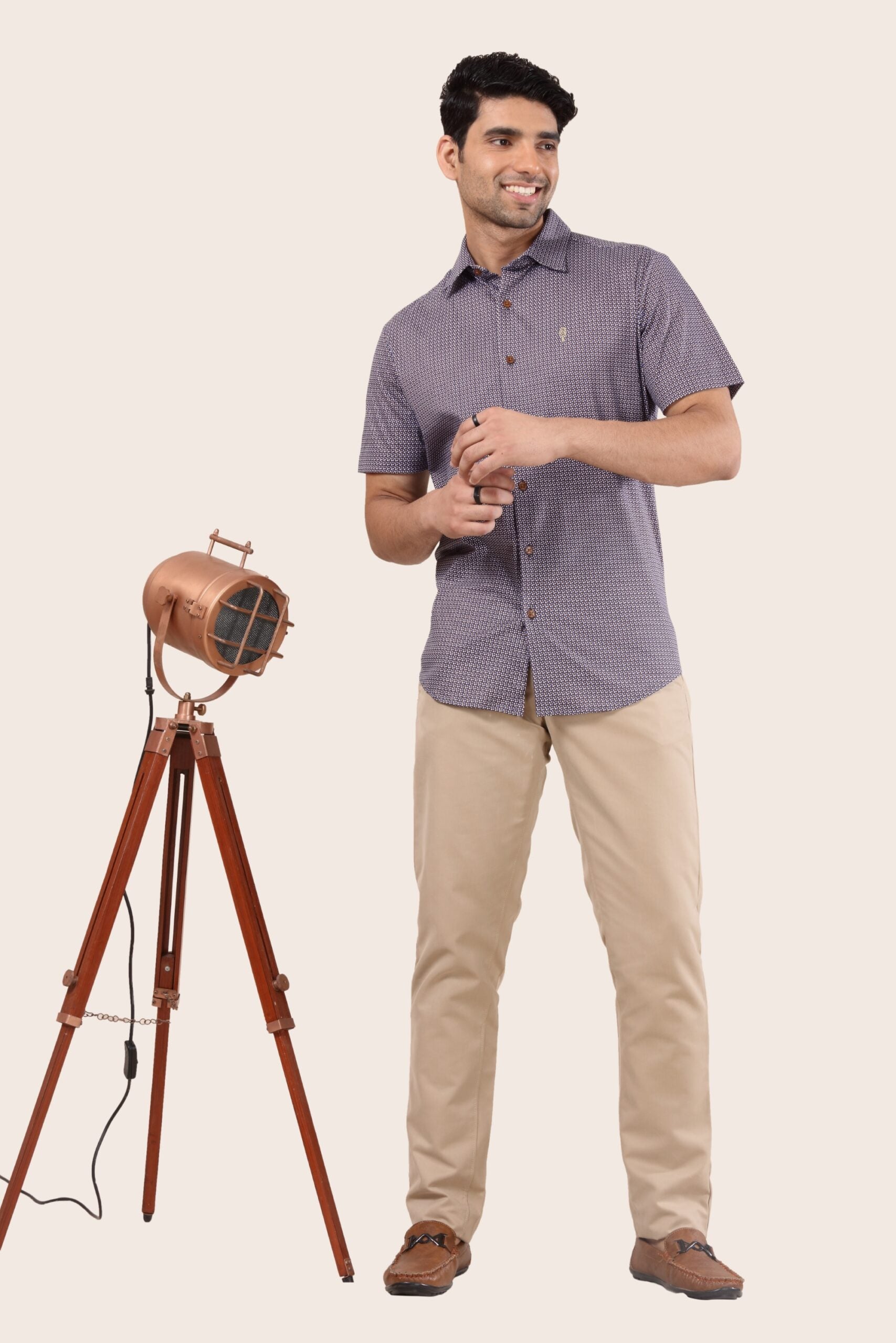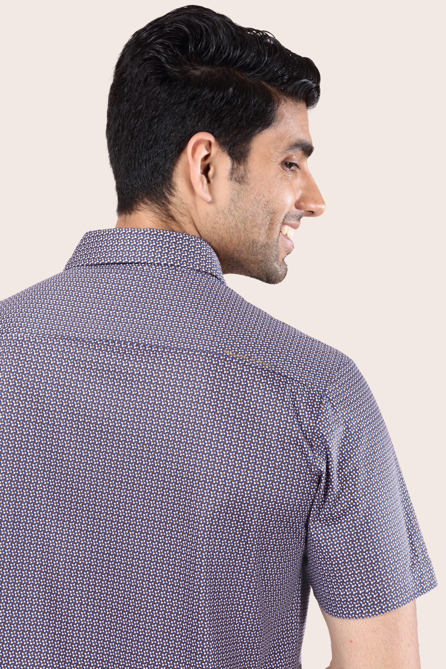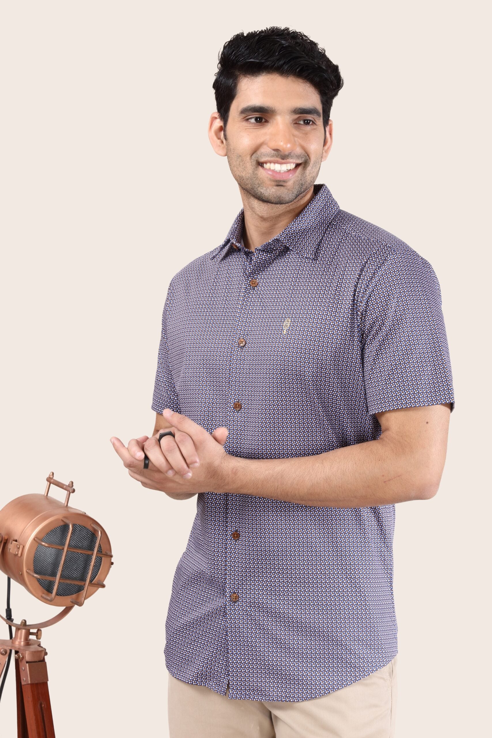 A premium half-sleeve shirt with a modern floral stencil print on a blue base. It is stylish and made out of 100's fine Pima cotton which is an extra long high staple quality fiber. This fabric is much more breathable and has a great drape. A must-have shirt that you can pair with a cool beige or khaki chino for a semi-formal look, a denim or a black trouser for a trendy, stylish chic look.