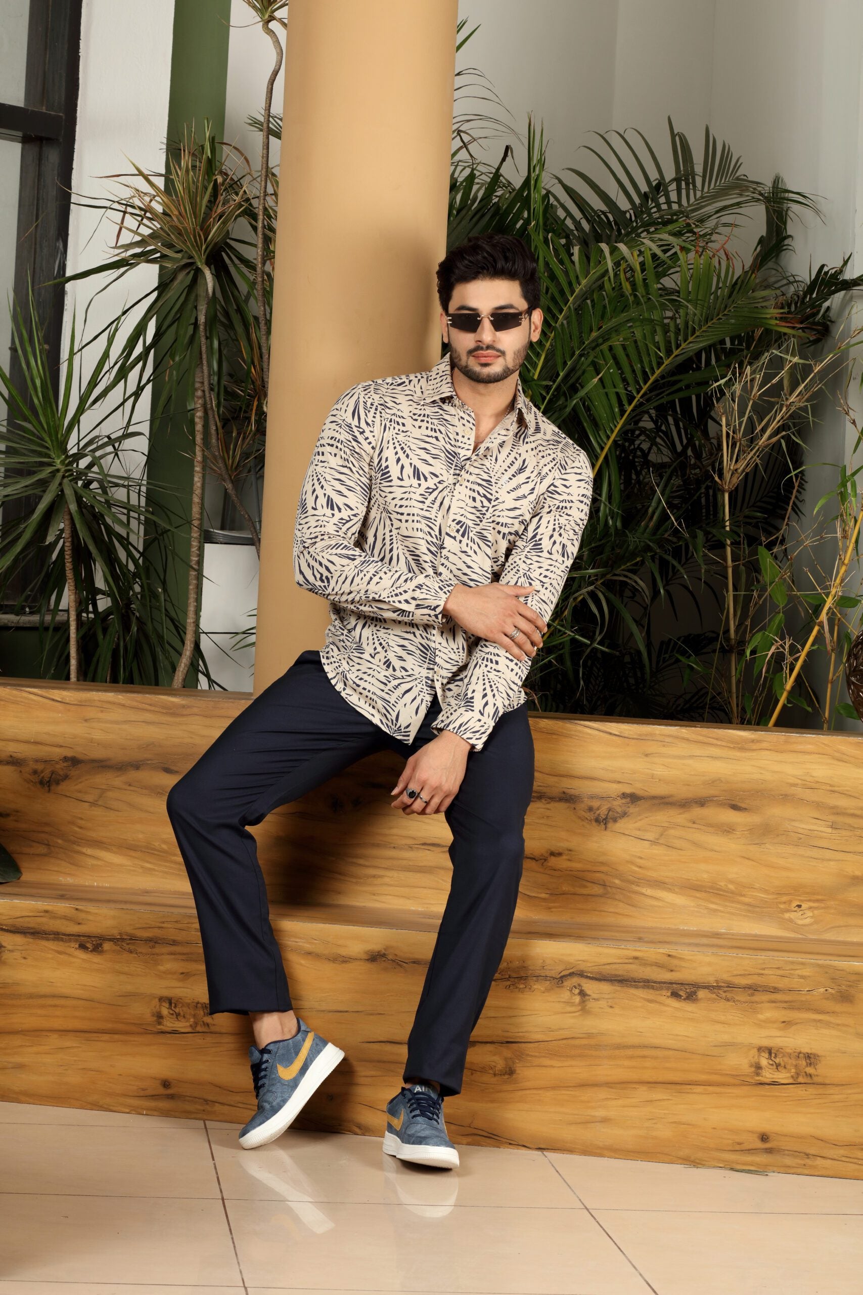 A premium shirt with a monochrome print in navy on a beige base. It is made out of 100's fine Pima cotton which is an extra long high staple quality fiber. This fabric is much more breathable and has a great drape. It has 5% spandex for that long-lasting comfort and stretch. A must-have shirt that you can pair with a cool beige or khaki chino for a day at work, a pair of denims and you will look uber-cool, or wear it with black trousers for a trendy, stylish suave look.