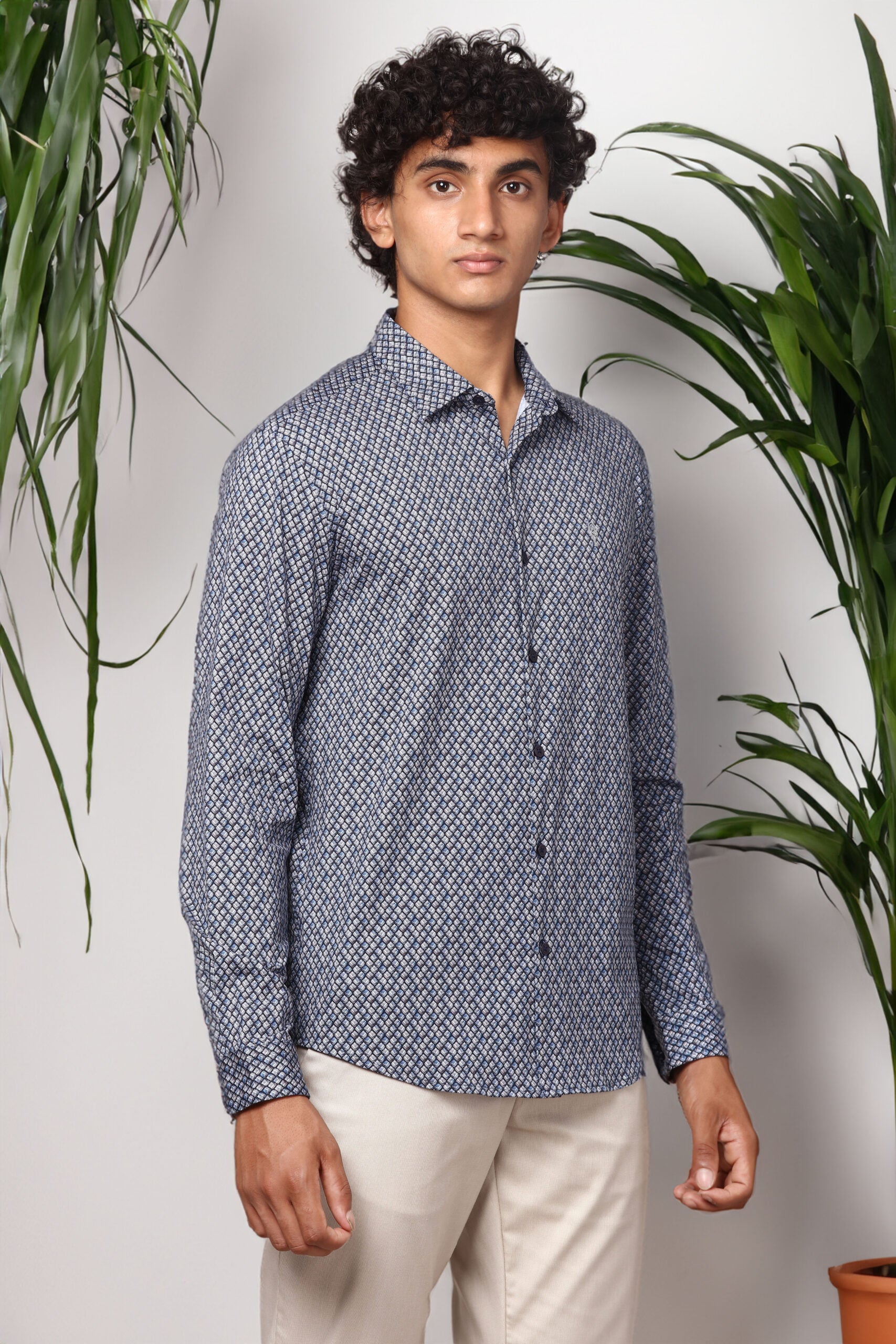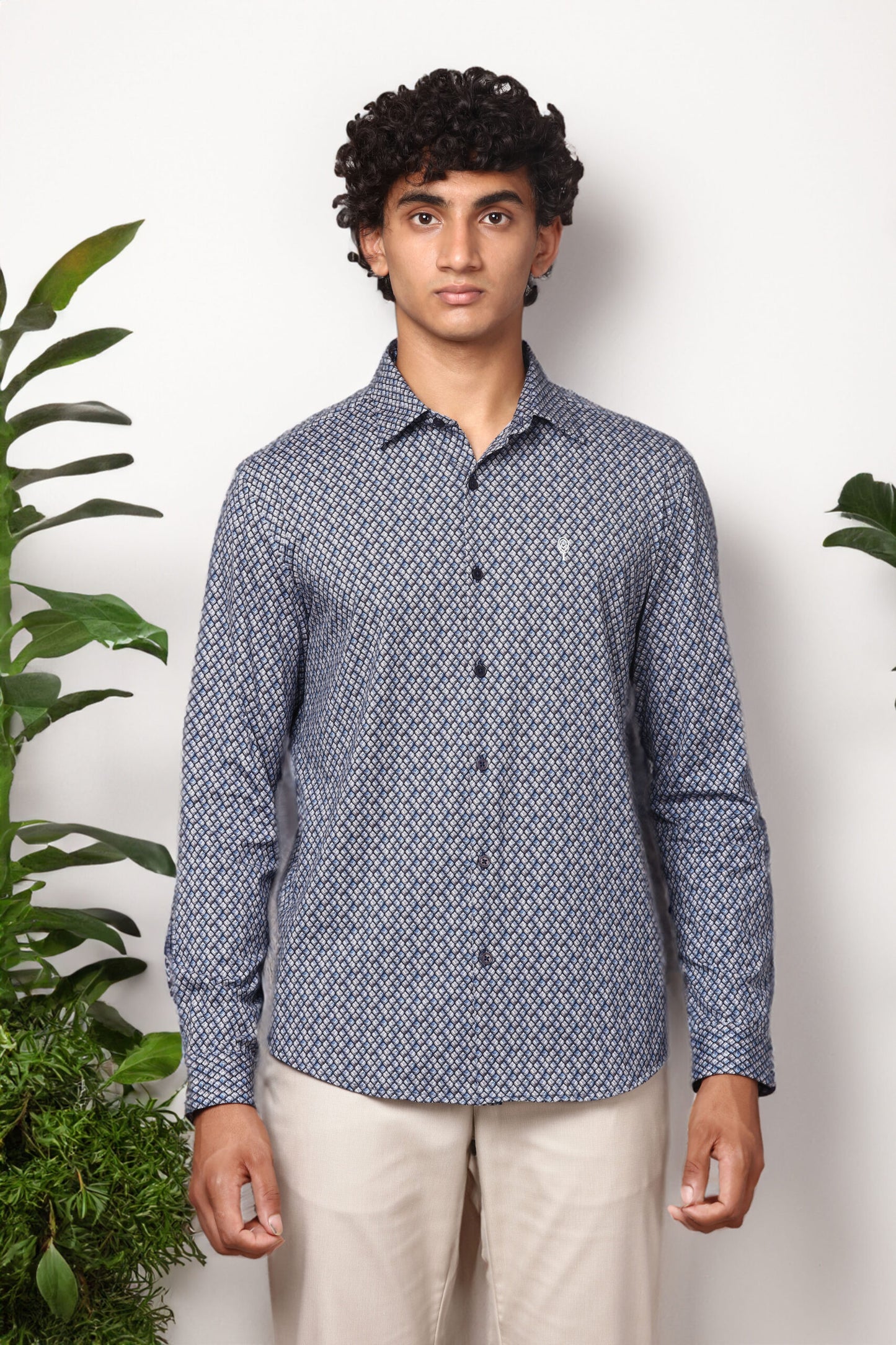 A premium shirt with a modern palm print weave in dark blue color. It is made out of 100's fine Pima cotton which is an extra long high staple quality fiber. This fabric is much more breathable and has a great drape. It has 7% spandex for that long-lasting comfort and stretch. A must-have shirt that you can pair with a cool beige or khaki chino for a day at work, a pair of denims and you will look uber-cool, or wear it with black trousers for a trendy, stylish suave look.